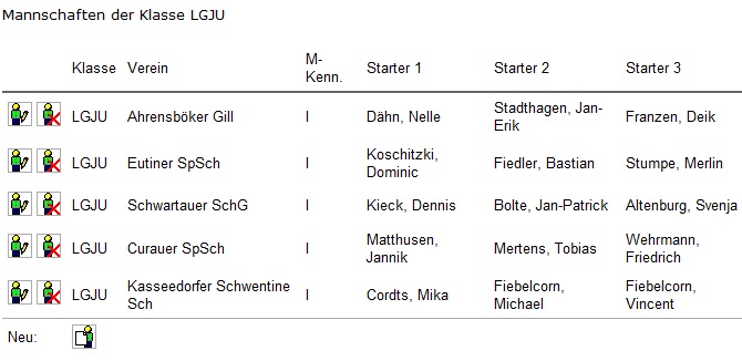 Es werden alle bereits unter dieser Gruppe erfassten Mannschaften gelistet. In dieser Maske können die Mannschaften in der Zusammensetzung der Starter auch geändert werden. Dazu später mehr. Wählt jetzt hier Neu